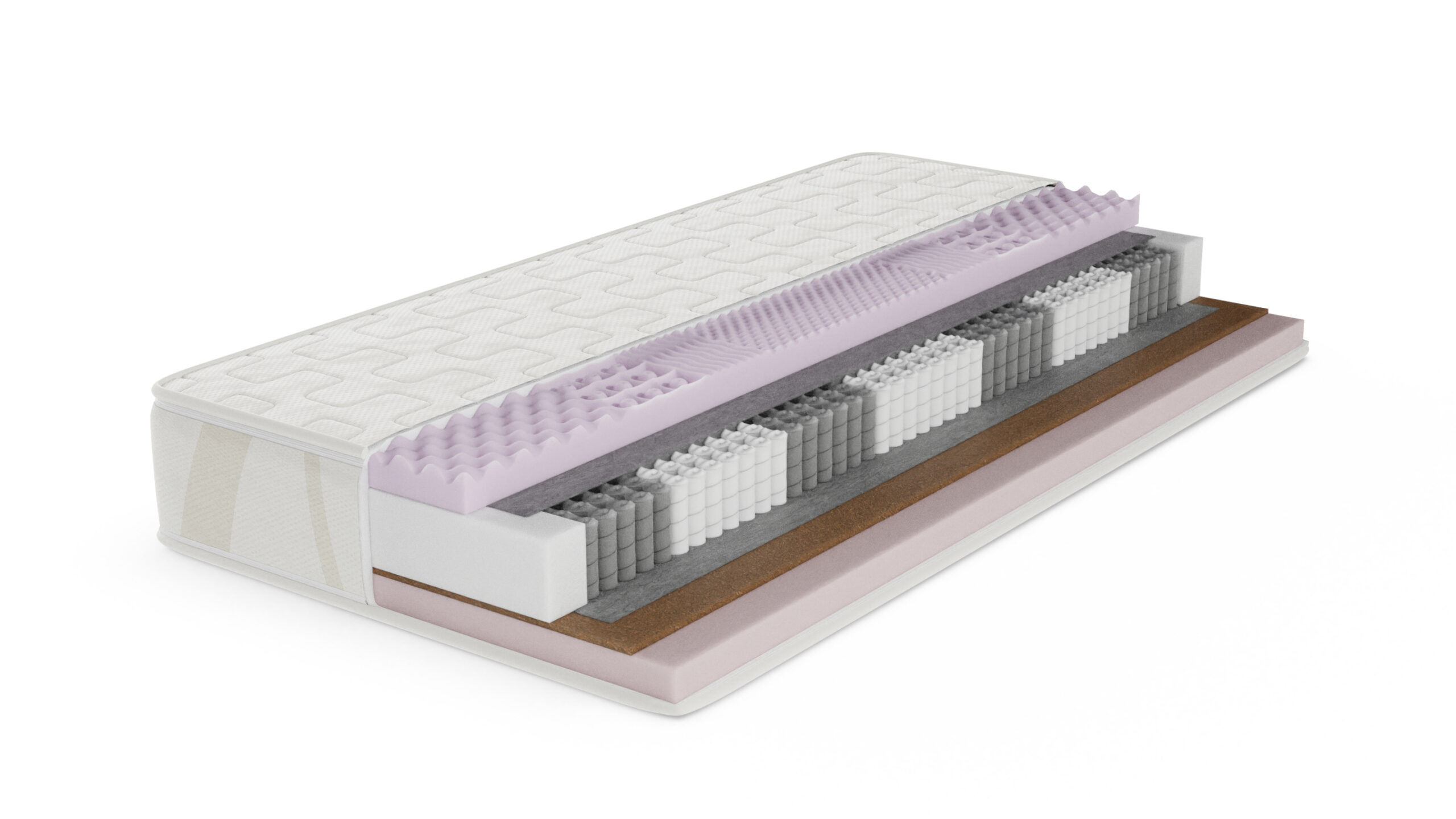 Materac z wkładem sprężyn kieszeniowych multipocket, z jednej strony znajduje się pianka wysoko elastyczna cięta 6cm, z drugiej zaś strony 1 cm mata kokosowa igłowana i pianka wysoko elastyczna 6cm